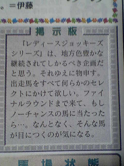休みがあります。家にいても暇だし、やっぱり見たいし、ということで 多分朝から土古に突撃です。 おそらく、当日は、平日とは言っても多くのファンと、 「お前、それ天体望遠鏡?」と言いたくなるような大きな望遠レンズをつけた カメラを持った人たち(苦笑)が土古に駆けつけるのでしょう。 やはり、注目は地元所属の瞳ちゃん&茜ちゃんということになると思われるの ですが、手元にある某東海公営専門紙(黄色と黒のロゴのほうw)では、 いずれも本命や対抗の印がつく有力馬をゲット。 この結果についてとやかく言う人は結構いると思うのですが(この記事を書く 直前に、どこかでそういう声を目にしました)イヤなら愛知県競馬組合に クレームのメールを送るなり、馬券を買わないなりすればいいと思います。 ただ、そういう声を極力出さないようにする策を考えるというのも 必要なのでは。 公開抽選会をするとか、どのレースも、(原則として)前走の 勝ち馬のみの出走にするとか。 前述の黄色と黒の専門紙のコラムでも意見があったので、画像を張っておきます。 たまには、いいこと書くじゃん、この書き手も。 基本的に甘い酒は好きではないのですが、せっかくなので、土古に寄った帰りに 買ってきました、カフェドパリ。 冬季限定の『パリの雪』を、予想を書き上げてから飲みたいと思います。 【KIRINカフェドパリ リリー賞】 ◎ロージーマイコ(名古屋・山本茜) ○ゴールデンサウンド(岩手・皆川麻由美) ▲エイガ(名古屋・宮下瞳) △ハヤツキスペシャル(高知・別府真衣) ×マスアワジボーイ(福山・池本徳子) 多少無理をしても逃げた馬・前に行った馬が圧倒的に有利な今開催の馬場。 それを踏まえると、やはり何もなければ逃げられそうなロージーマイコが 何とかしそう。行き切れれば。 折り合いさえつき、中団より前に付けられれば、という条件付きではあるけれども 時計的には大差はないゴールデンサウンドの差し切りもあるか。 某紙では本命のエイガも、勝ちきれないところはあるけれども、外枠を利して 揉まれずに先行さえできれば。 腕っ節はかなり強そうな感じのある池本が、押して叩いて力づくで前に 持っていければ、マスアワジボーイの粘りこみで大波乱の予感。 《買い目》 ・馬単 ◎←→○▲△× 【KIRINカフェドパリ アイリス賞】 ◎クードゥフードル(浦和・平山真希) ○コスモシレナ(愛知・宮下瞳) ▲ベルシャワー(愛知・山本茜) △ミスズシャープ(岩手・皆川麻由美) ×バトルバーズアイ(高知・森井美香) 正直なところ、鞍上には不安。しかし、こういうジョッキー対抗戦では 力のある馬を素直に買っていけばいい気もします。 ということで、転入以来 クードゥーフードルから買います。 ※棒線部を訂正しました。 前走は吉田稔の手綱捌きもあったとはいえ、1800m戦で 2分2秒0の勝ち時計。この中では力が違うのでは。落ち着いて乗れさえすれば 問題ないと思います。 前走を好タイムで勝った転入2戦目コスモシレナは、逃げるか 好位に付けられさえすれば、連勝もありえない話ではないはず。 スタートに難があるベルシャワーも、そこそこのタイミングでスタートを決め、 うまく追走できれば。 行きたい馬がかなり多いけれども、行ききってしまえたら上昇ムードの ミスズシャープにもチャンスはあるかも。 バトルバーズアイは、無理に逃げなくても転入初戦のように好位からのレースも できる馬。前がガリガリやりあうようならば、控えて差すということもあるか。 《買い目》 ・馬単 ◎←→○▲△× 両レースとも、3連単で当てる自信がないのですが、 買うとしたら、現地でじっくり考えて決めたいところ。 出来レースだの何だのと、くだらないことを言わせないような熱戦を期待します。 (1月6日2時30分頃追記) 朝から土古に突撃し、久々に第1レースから馬券を買いました。 途中で集中力が途切れそうになりもしましたが、何とか完走。 多くの職場で年末年始の休みが終わり、ド平日にもかかわらず、かなりの お客さんが土古に来場。正月開催は、どの日もなかなかの入場者数だったように 思うのですが、名古屋記念のあった3日とさほど変わりのないように見えたのには 少々驚きました。 これで、売り上げが『5日>3日』だったら、ちょっと複雑な気持ちになりますが。 それでは、予想を振り返りましょうか。 【KIRINカフェドパリ リリー賞】 ※上記買い目のほか、 ・3連単フォーメーション ◎→○▲→○▲△×、ハクシンノバ ・馬単 ◎←→ハクシンノバ を追加購入。 馬単◎→▲、3連単◎→▲→○的中。 最内枠で、普段着用しないブリンカーを装着していたハクシンノバがどうにも 気になってしまい買い足し、買い目が少し増えましたが、何とか引っかかり、 ほっとしました。 逃げた馬が多少のことでは止まらない、差し馬が届きそうで届かない 今開催の馬場。やはり、馬場を熟知している上に逃げ馬を引きあてた 茜ちゃんが有利でしたか。人気に応える見事な逃げ切りでし