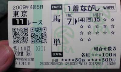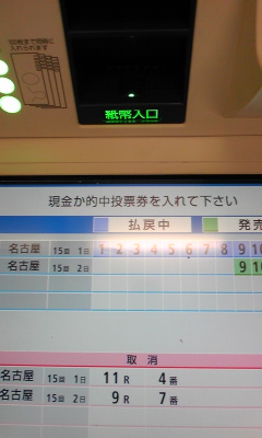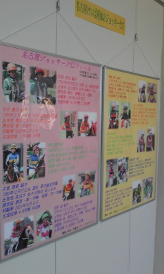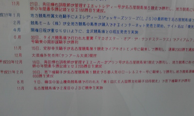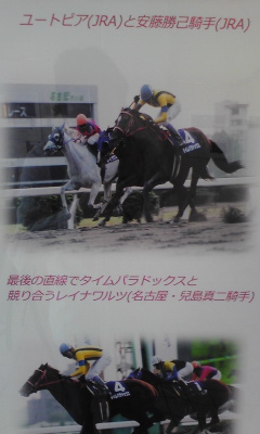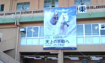 JRAも"CLUB KEIBA"のスポットCMをガンガン流したり、『SUPER SURPRISE 』の 中で、生CMをやってみたり(2センチと言われる昨年の1・2着馬の着差は、 田中裕二の身長と同じ、などと太田光がボケていましたが)と、正直、必死だなと 思わずにはいられませんでした。 こちらの方はほどほどにして、京都の障害オープンだとか、3日のJBCの方に 資金を多く回すことにします。世間一般の自称競馬ファンは、まったく 逆なんでしょうが。 天気が心配ですが、馬券を仕込んだら、JBCスペシャルトークショー in NAGOYAを 見に、久屋大通公園へ行こうかと思います。 レースの模様はワンセグか、帰宅後、JRAホームページでの映像で確認するかも。 問題は、会場がエンゼル広場、久屋広場、光の広場の内のどこなのかということが どこにも書いていないことなのですがw。 多分、久屋広場でしょうけど。 ◎ウオッカ ○シンゲン ▲ヤマニンキングリー △アドマイヤフジ 前走は、府中では勝ち星のなかったカンパニーに差し切られるという 失態を演じたウオッカ。この敗戦で、衰えが見えたなどという 声もありますが、これと言った逃げ馬不在の中、好スタートから押し出される ようにハナに立つことになり、不慣れな逃げるレースを強いられた結果だった と思います。 今回は、最内枠を引いたコスモバルクをはじめとして、スクリーンヒーロー、 アドマイヤフジ、キャプテントゥーレなど前に行きたい馬が多くいるので、 これらを行かせて壁を作ることができれば、好位で脚を溜めることは十分に 可能なはず。好位から中団でのレースになりさえすればGⅠ通算7勝目という 結果は、普通に付いてくると思います。 相手ですが、バリバリの府中巧者で、前走は、右回りでも一応の結果を出した シンゲン。 もともと、コースを問わず好走できていた馬だし、前走に見られたイレコミが 見られなくなる、馬体が回復するという条件付きではありますが、前述の点が 解消されれば、もっと頑張れていいヤマニンキングリー。 左回りには良績はありませんが、スミヨンへの乗り替わりという点には 警戒が必要と思われるアドマイヤフジ。 カンパニーですが、前走は完全に展開が向いただけなのでは。 アサクサキングスは、恐らく叩き良化型。 オウケンブルースリと、ドリームジャーニーは、左回りよりは右回り、 府中よりは京都、阪神という印象。 サクラメガワンダーは、府中は苦手なのかも。 マツリダゴッホですか。有馬記念でお待ちしております。 そんな感じで、これらの馬はバッサリと。 あとは、コスモバルクは、鞍上が五十嵐冬樹であれば、全力で買うのですが。 盛岡での前2走は、岩手のトップジョッキーの一人、小林俊彦だったので もやもやした思いを抱きつつも、普通に買いました。 せめて、引退レースのときは、冬樹を乗せてほしいものですが、無理か。 《買い目》 ・馬単 ◎→○▲△ (11月1日21時頃追記) ハズレ。 前売りで馬券を仕込んでから、時間を潰して、久屋大通公園へ。 あいにくの雨ということもありましたが、事前の宣伝不足なのか、 "JBCスペシャルトークショー"というだけではカタギの人には何がなんだか わからなかったのか、寂しい客入り。ていうか、ロゴマークに頼らず、 きちんとしたフォントで『JBC』と書こうぜ。 左上:会場にあった、イベントスケジュールの案内看板。 右上:開演2分くらい前の客席。最終的にはもう少し増えたけども。 下:その他大勢扱いされた、井上オークスと、名古屋競馬の騎手たち。 内容の方も、JBCとは何かという説明も、当日どんなレース、イベントがあるのか、 といったことの説明も不十分に感じられ、ただ単に、司会の長谷川満が、 藤川京子、井上オークス、そして、参加告知はされていなかったはずの吉田稔、 山本茜、宇都英樹(ステージへの登場順)とダラダラ話をするだけ、というものに 感じられました。 3度目の土古でのJBC開催があるときは、ウインズ名古屋あたりで、競馬好きだけを 集めてこういうことをした方がいい気がします。どれくらいの金や手間が かかったのかはわかりませんが、この程度の出来でしかないのだったら、 やってもやらなくても同じ。愛知県競馬組合は、もっと上手に、頭と金を 使ってほしいものです。 まあ、組合のやる気の無さは、今に始まったことではないですが。 さて、本題。 平均からスロー、という感じのペースで流れた道中。流れがある程度緩ければ、 ウオッカもカンパニーもほぼ同じくらいの上がりを繰り出せるわけですが、 同じくらいの末脚を持っているのならば、当然、少しでも前にいるほうが 勝つわけで。 ロスなくコースを回り、かつ、ウオッカよりも前にカンパニーを走らせていた 横山典弘の戦術勝ちですね。 ただ、直線で隣り合った位置に2頭がいて、どちらにも前が塞がるなどの不利が 無ければ、ウオッカが勝っていたのかも。 このレースの連覇が期待されたウオッカは結局3着に終わりましたが、外を 回せていた