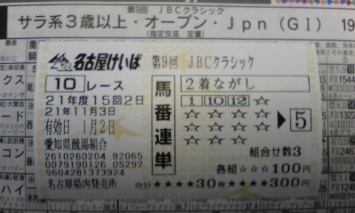 いろいろあって、前回ほどの気持ちの高まりはありませんが、何とか 有給休暇をねじ込めたので、朝から現地へ突撃します。 月曜日は休みだったこともあり、馬場状態の確認も兼ねて土古へ行って きましたが、11月とは思えないくらいの寒さ。シリーズ初日のレースには 目もくれず、入り口前に陣取っていた徹夜組の皆さん(写真の真ん中あたり)は、 今晩の寒さをどう凌ぐのでしょうか。 GⅠなどのダート重賞があるときだけ、のこのこと土古にやってきて 僕たち競馬ファンなんです、なんて態度をされても、正直なところ困るのですが、 それなりのお金を落としてくれると思われるので、我慢です。 場内は、それなりの雰囲気作りがされていました。こんな感じ。 カメラがしょぼくて、アレなのですが、ゴール前の内ラチにも、さりげなく レース名が書かれていたり。 建物自体がまったく機能していなかった第3スタンドも、部分改修工事が終わり、 観戦スペース、有人の投票窓口、展示室として使えるようになっていました。 展示室の中には、競馬組合の歴史だとか所属騎手の紹介をするパネルや、 過去のJBCに関する写真・資料(宣伝用ポスター、歴代優勝馬の写真)などが。 11月4日以降も、有効に活用していただきたいものです。 そして、第2スタンドには、土古では初めてとなる発売・払い戻し兼用の 発券機が12台設置。お金の代わりに当たり馬券を投入して新しい馬券を 買えるかどうかまでは確認するのを忘れました。 たかだか12台増やしたところでどうなのかとも思いますが、 こういう設備投資は、どんどんやってほしいですね。 あとは、パドックの隅に、馬の形をした、かわいらしいプランターが。 雰囲気作り、混雑回避などのそれなりの努力はしてきたかな、という印象を 受けました。あとは、大したトラブルも無く、興行を終えられるといいのですが。 それでは、予想の方に。 【JBCスプリント】 ◎アドマイヤスバル ○ビービーガルダン ▲スーニ △フジノウェーブ フェラーリピサの出走取消は、残念な限り。 一気の距離短縮がどうなのかとも思いますが、アドマイヤスバルの好調さを 買いたいところ。 ポートジェネラル、ノースダンデーなどが逃げを打ち、それなりの、よどみの 無い流れができるはず。好位から中団の内目で、前を見ながらのレースが できるこの馬に流れが向くのでは。 ビービーガルダンのダート適性はまったくもって未知数ですが、とりあえず、 前に行ける力があるという点は、逃げ・先行馬天国の土古では強力な武器。 スーニは能力は確かですが、コーナーを4つ回る小回りコースでの適性が どうなのか。兵庫チャンピオンシップでの敗戦に、そのあたりへの 不安を覚えます。 理由はどうあれ主戦の御神本が乗れない、大井1200m>小回り1400mという点が 気になるフジノウェーブですが、レースの流れそのものは向きそう。 《買い目》 ・馬単 ◎→○▲△ 【JBCクラシック】 ◎ヴァーミリアン ○マコトスパルビエロ ▲ワンダースピード △マルヨフェニックス なぜフリオーソは回避したのでしょう。ヴァーミリアンに恐れをなした、 南関東以外では良績を残せていない、といった点を考えてのことだとしたら、 言葉は悪いですが、川島先生は相当のヘタレということになりはしませんか。 勝てるレースを選んで使うのも、調教師の立派な仕事の一つですが。 このメンバーならヴァーミリアン本命で仕方の無いところ。連軸としては 最適だと思います。あくまで連軸としては。 ヴァーミリアンは、ここまでに地方戦も含めGⅠで7勝という素晴らしい実績を 残し、このレースで8勝目がかかります。強さは文句なしだし、鉄砲も バリバリに利く馬です。ただ、不安な点は、GⅠ8勝目を目指してきた 過去の名馬たちが、ことごとくその壁に阻まれてきたこと。 シンボリルドルフも、テイエムオペラオーも、アドマイヤドンも、 カネヒキリ、ブルーコンコルドも、みんなそうでした。 歴史は繰り返す。そんな気がしてなりません。 脚質的にも、ある程度前に行くレースもできるけれども、中団あたりからの 差すレースが持ち味。展開次第では、前が残る土古の馬場にも阻まれ、 差し届かずということもあるのでは。 秋の馬場改修工事で多少はマシにはなりましたが、逃げ・先行が圧倒的に有利で、 とりあえず前に行かないとどうにもならないのが、土古の馬場の特徴。 ヴァーミリアンに土をつけるとしたら、前に行って頑張った馬ということに なるのではと思います。 小回り向きの先行力を持つマコトスパルビエロ。逃げられるのなら逃げるだろうし、 前走は3番手からのレースで勝ったように、控えても何とかなるか。 重賞2連勝中の勢いに、笠松所属時代に数え切れないくらい乗っていた 土古コースを良く知る鞍上の力が加われば、波乱を起こすということも 十分に可能でしょう。 ワンダースピードも先行力と揉まれない大外枠が魅力的だし、3コーナーまでの 距離が長い1900m戦であ