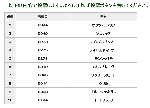 慌ててネットでの投票を済ませました。 "出走させたいと思う3歳以上のオープン馬"というのが、投票に関する 要件だったので、こんな感じの投票 であっても、誰にも文句は言わせませんw。 芝2500mだというのに、短距離馬だとか、バリバリのダート馬に 一票を投じる人だっているわけですから。 ちなみに、1頭を除いて、主戦場は障害であっても、平地の格付けではオープン馬。 ※ワンダースピードは、ワンダーシンゲキと勘違いして入れてしまいました。 投票が完了してから気づいてやがんの、ワシ。 |
