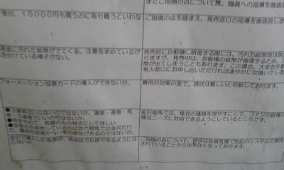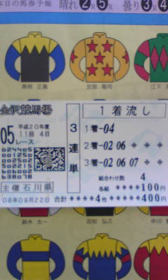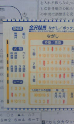 撮影技術がないということがあり、画質が今ひとつですが、ご了承ください。 馬券の調子が良く、交通費が捻出できたことや、一度も行ったことがなかった ことなどもあり、22日(月曜日)に、休みを利用して金沢競馬場へ行ってきました。 重賞のオータムスプリントカップが行なわれ、今年の正月から注目している サチコゴージャスをはじめとする東海勢が大挙して金沢へ乗り込むということも 大きかったのですが。 JR名古屋駅からは、特急しらさぎで約3時間程度。途中、車両の進行方向が 逆になる米原で座席を回転させることを除けば、いたって快適です。 今回は、金券ショップで仕込んだ回数券(店によって多少差はあるが6100円前後が 相場)で座席指定をしましたが、青春18きっぷの利用期間だったら、迷うことなく 在来線の快速などを乗り継いでいましたねw。 朝から、ビールとサンドイッチで乾杯。縁起を担いで、カツサンドと一番搾りを 選んでしまいました。 一杯引っ掛け、一眠りして金沢駅へ到着。駅の西口から無料送迎バスが出ている ので、それに乗って競馬場まで。20分ぐらいですね。 車窓からの景色は、どこにでもありそうなもので、ここは金沢なんだろうか とも思えましたが、一枚のポスターで、自分が石川県にいることを実感。 自民党の馳浩衆議院議員。 そうだよ、馳は、石川1区の議員じゃないか。すっかり忘れておりました。 湖南運動公園に隣接し、競馬場のスタンドからは河北潟を臨むことができる ロケーション。周りに大きな建物がないこともあり、何とも言えない開放感の ようなものも感じました。 入場してしばらくは、場内の散策と、競馬場グルメのチェックに時間を 費やしました。 いろいろ考えて食べたのは、入場門近くの玉寿司の寿司、パドック横の 食堂の冷やし稲荷うどんと、目玉肉焼きそば(いずれも屋号不明)。 玉寿司では店内で食べたかったのですが、お客さんが多く、仕方なく 持ち帰り用の盛り合わせを購入。店内で握りたてのものを食べれば、また 評価は変わるのでしょうが、まずまずの味でした。次こそは店内で。 3連勝式の馬券も発売されていますが、これらを買うときに絶大な威力を発揮する マルチ・フォーメーションのマークカードは、導入されていません。 ただ、ながし用のマークカードで、軸1頭を固定したフォーメーション的な 買い方は可能です(3連単で◎→○▲→○▲△×とマークして計6点とか)。 そのあたりの周知は徹底されていないように見受けられたのは残念なところ。 この日は、雨は降らなかったものの、前日から馬場状態があまり回復しておらず 終日、重馬場でのレース。普段、金沢競馬をネットで購入している時には 自分のペースに持ち込んでいるように見える逃げ馬が失速するケースを 良く目にするのですが、この日は、逃げたり先行した馬がそのまま粘りこみ、 差し馬の出番がないというレースが多く見られました。馬場状態も自分なりに 把握し、ビシビシ当てるぞと意気込んだものの、ヒモが抜けたり、 前に行きそうな馬を読み違えたりで、順調にハズレ馬券を生産していきました。 若干のマイナス収支、飲食代を含めれば大赤字wで臨んだ、メインレース。 専門紙の印からも混戦ムードが漂い、オッズも割れ加減でしたが、激化する 先行争いを見ながらズバッと差せそうな笠松・シールビーバックを軸に購入。 落ち着いて周回できていたもののパドックでの発汗がもっともキツいように 見えたのが気がかりでしたが、愛知・サチコゴージャスも押さえました。 レースは、サチコゴージャスがハナに立ち、他馬を引き連れるような流れ。 先行集団のやや後ろのほうから逃げ馬をマークしていたシールビーバックが 徐々にインコースから進出し、直線で抜け出す。このまま濱ちゃんと丸野で 決まるか、と思いきや、後方に待機し、追い込みに賭けたケイアイカルディナが 直線で粘るサチコゴージャスをゴール手前でかわして2着入線。 軸はバッチリだったのですが、ここでは力不足と感じ、ケイアイカルディナは 買っていなかったのです。うそーん。見事にヒモ抜けやん_| ̄|○。 しかも、万馬券決着。 レース前は、冗談のつもりで東海公営組だけのボックスを買おうかな、とも 考えてはいましたが、パドック、返し馬の段階でそんなことはきれいさっぱり 頭から抜け落ちていました。ああ、こんなことなら、事前に仕込んでおくべき でした。馬連5頭ボックスでも5000円戻ってきたんだよなあ。 それを、昔から、後の祭りとか、覆水盆に帰らずなんていうんですよ、自分。 ということで、覚え書き。 ・東海北陸地区の交流重賞では、東海公営馬のみのボックス馬券を買う。 ・馬連や馬単などで軸を決めたら、他馬の人気等に関わらず、総ながし。 自分の馬券下手さに呆れ、がっくりと肩を落としつつも最終レースを購入。 なんとか当てたものの、獲って損となり、マイナス収支が確定。 まだまだ勉強不足です、いろんな面におい