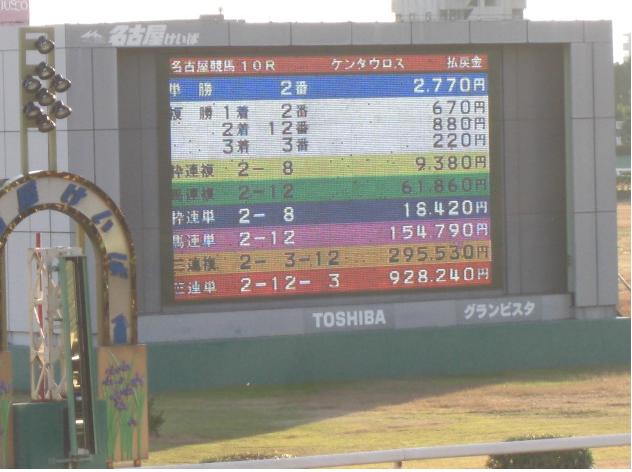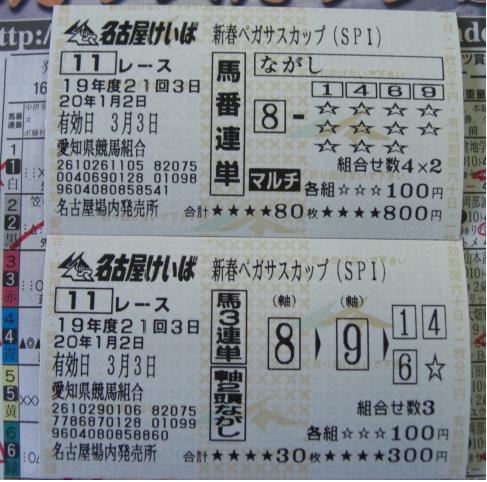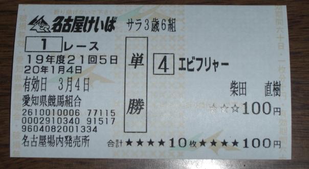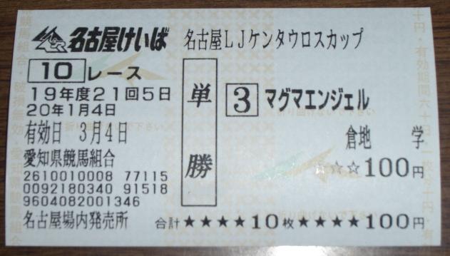 ワシは、幸か不幸か、まだまだ休みです。馬券とか、最近やっている ネットワーク対戦クイズゲーム『アンサー×アンサー』とかで無駄遣いしすぎ ないように気をつけなければ、と思います。 まあ、使う分は、馬券で捻出すれば、それでいいのですがw。 さて、今日は、新年の土古名物のジョッキー選抜レース。 前年のリーディング上位が、抽選で決まった馬に騎乗する一戦です。 ワシの期待は、やはり、この馬。 すんません、新聞読んでたら気になってしまって、前日夜間前売りで 仕込んでしまいましたw。 今日の第1レースがデビュー戦。いきなりは難しいですが、応援と いうことで。 あと、これだけは言っておきたいのですが、名古屋人は、世間一般が 思っているほど『エビフリャー』なんて言いません。ワシらの祖父母の 世代でかろうじて言うか言わないか、という程度ですので。 ネタはともかくとして、本当の注目は、この馬と騎手でしょう。 勝てば、"ミスター・ケンタウロスカップ"倉地学は、このレース4連覇です。 ◎テルミヌス(吉田稔) ○ヴイグランプリ(戸部尚実) ▲マグマエンジェル(倉地学) △ミスターキセキ(今井貴大) ×ミズサワジョンコ(岡部誠) ×メモリーフロック(宇都英樹) 多少は差しは利くかと思いきや、やっぱり逃げた馬に有利に働く 今開催の馬場。新春ペガサスカップ、名古屋記念ともに、決まり手は逃げ切り。 とにかく前に行ける馬を選ぶことが、的中への近道でしょうか。 道営からの転入初戦で2着のあと、ここに臨むテルミヌス。 決め手もないですが、バテないという印象。ただ、今回は1枠を引き、 鞍上も吉田稔。ある程度のレベルのスタートを切れれば、逃げてor先行して コーナーワークでいいポジションにつけられるはず。 地方、中央通じて未勝利の馬ではありますが、先行力と、前に行った馬に 有利に働く馬場、そして、全国レベルの名手の腕前という条件が合わさり、 生涯初勝利というのも十分にありえるのでは。 前走は◎と同じレースを走り、好位から伸びずに0.4差の4着となった ヴイグランプリ。先行脚質とはいえ、1800m戦で外枠というのはやや辛いものが ありますが、転入2戦目での慣れも見込めていいはずだし、兄があの ヨシノイチバンボシ。そういう意味での期待もかけていいか。 抽選で騎乗馬を選ぶこのレースで、(12 6 9 18)のマグマエンジェルを 引き当てるとは、倉地学のくじ運には恐ろしさすら覚えます。 長らく勝ち星には見放されていますが、スタート直後に3コーナーに差し掛かる 1800m戦で、この枠というのは、やはり恵まれています。先行できれば 粘りこみも可能でしょうし、流れ次第では、前人未到の4連覇もあるか。 B1組特別戦で堅実に走っていることを考えると、ここではミスターキセキの 力は通用していいはず。しかし、差し・追い込みに不利な馬場の上、 この馬自身がバリバリの追い込み型。展開ひとつで、どれだけ追っても 届かないという可能性も、考えなければならないでしょう。 そして、新春ペガサスカップのイーストミー(1番人気6着)、名古屋記念の ケイアイフウジン(3番人気5着)と、上位人気を連続で飛ばしている 『競馬エース』1面の"今日の顔"に取り上げられたことは、不安です。 あのコーナーが持つ負のパワーには、侮れないものがあります。 あとは、久々とはいえ、先行しても差す形になっても結果は出せているし、 昨年の土古リーディング・岡部誠の手綱捌きで一発を期待したい ミズサワジョンコ。 ここ2走はいずれも4着とはいえ、そう極端な負けではないし、中団よりも 前あたりに付けられれば差せそうなメモリーフロックを。 12頭を半分に絞るだけでも一苦労です…。 《買い目》 ・馬単 ◎←→○▲△×× ・単勝 ▲ どう考えても堅くおさまりそうにない一戦、という気がします。 (1月5日0時45分頃追記) ハズレ。 冠協賛レースの前に、土古に到着。(あのレース、いったいどういう 意味なんだろう)と思い、帰宅後、検索をかけたら、フェリー好きの 人がやってるホームページのイベントでの出来事から来たものらしい、 ということまでは判明。内輪ネタ万歳というところでしょうか。 ページそのものは、良くできていると思うのですが、管理人の個性が 出すぎていて、かえって痛かった(これでも、控えめな表現)ので、 リンクを張るのはやめます。実際、読んでいて気分悪くなったし。 レース名などを利用して、各自でググってください。 それにしても、メインレースは、ここまで荒れるとは…。 マグマエンジェルがどうにか3着にかすっただけですか。 勝ったサントアドヴァンスは、何と2年1ヶ月ぶりの勝利。 移籍前の道営では、人気薄での3着が2度あったのですが、スムーズにレースを 進められるとこれくらいはできるということなのでしょうか。 道中もしっかり折り合っていたし、勝負どころの手ごたえもかなりいいように 見えました。前走の大敗はレース中の鼻出血発症(新聞にも書いてありました)と 理由がはっ
