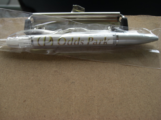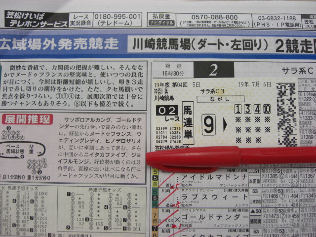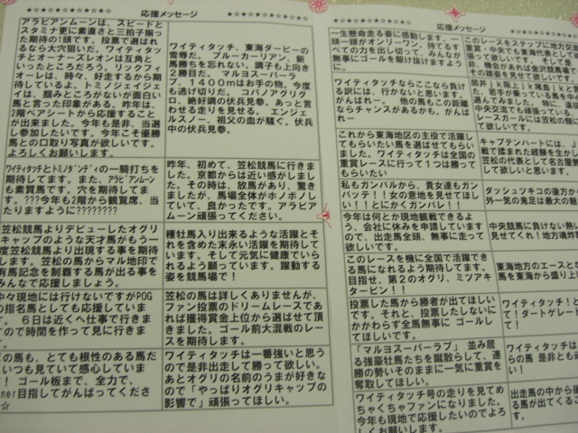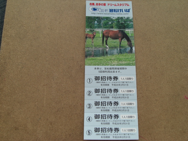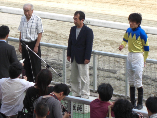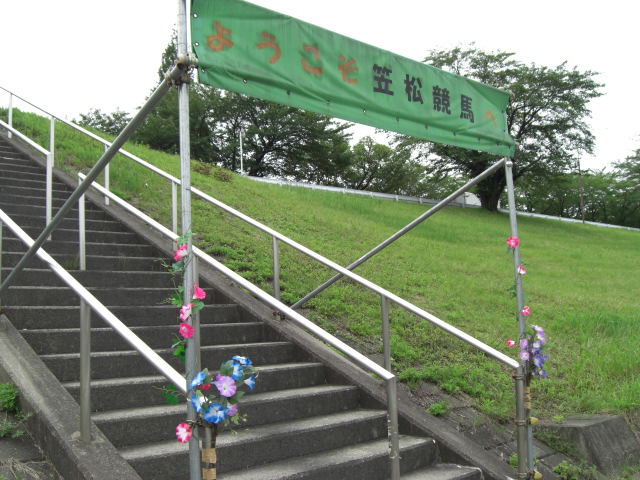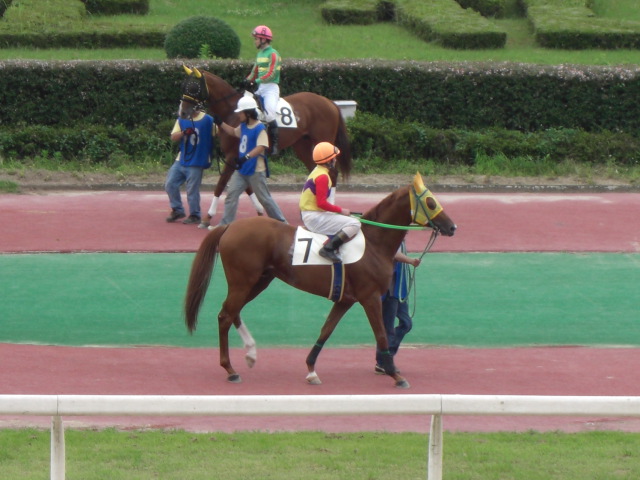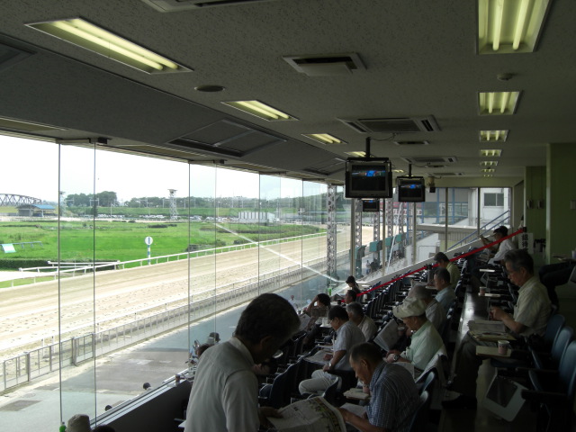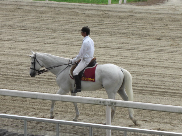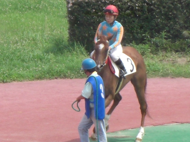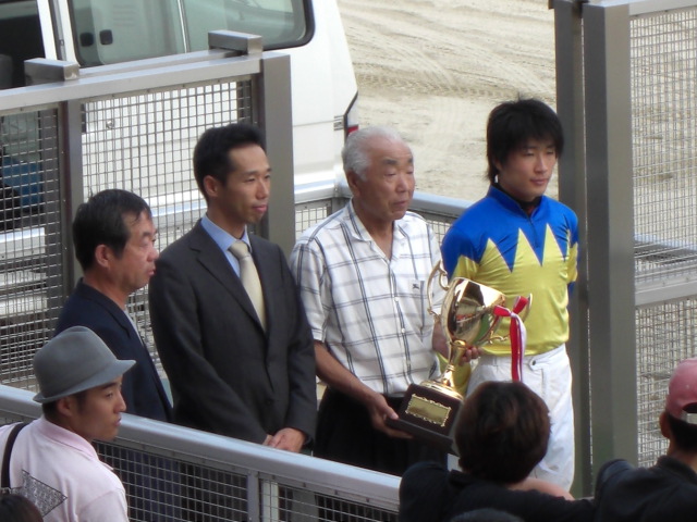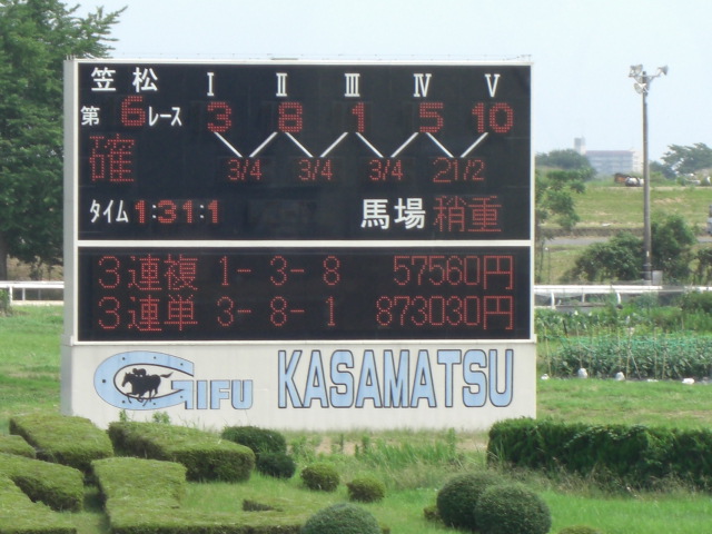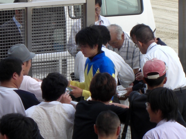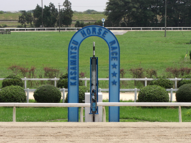 (以下、OPFSと略)が行われた7月6日の笠松競馬場のことを、あれこれと 書いてみようと思います。 先日購入したデジカメで撮った写真も付けてみます。 写真の腕前については、大目に見てください(苦笑)。 この日は、朝8時から能力審査の模様も公開されるとのことでしたが、 早起きができず、結局、1レースに間に合うように現地入り。 名古屋駅からは、名鉄で、岐阜行きの急行か快速急行で。約30分くらいでしょうか。 改札を出て、競馬場へ向かう途中には、こんな光景が。 警備員の方が、交通整理をして、横断歩道のない道路を渡らせてくれるのです。 ここを通らないと、相当大回りになってしまいます。 道路を横切り、堤防を越えると、競馬場正門へ行けます。電車で来る人は、 ほとんど、このルートでしょう。 ワシはと言うと、ネット経由でしたOPFSのファン投票で当選した招待券の 指示に従い、先ほどの写真のところからは少し歩いて、東門からの入場。 横断歩道を渡ると、こんなゲートが。 これをくぐって、東門へ。 東門はこんな感じです。 手続きを済ませ、招待席のあるユーホール(自由席。当日は、通常500円の 料金が無料)へ。 いろいろと記念品をもらいました。 順番に、オッズパークのロゴ入りボールペン、5枚つづりの招待券、 そして、この日の有力馬、マルヨスーパーラブに騎乗する尾島徹のサイン色紙。 本来なら、ネット投票時に応援馬に指名したプラチナクラウン(愛知)に 騎乗予定の騎手のサインをもらえるはずだったのですが、回避となり、 繰り上がりが発生し、運良くこうなりました。ついてるなあ、自分。 ユーホールから撮った一枚。パドックの様子や、ゴール付近の攻防は 良く見えます。1400mのスタートは見づらいですが、モニター画面で カバーは可能。 誘導馬のハクリュウボーイ。オグリキャップと同期だそうです。 笠松の"ながし"用マークカードには、マルチやフォーメーションの機能は ありませんが、下の写真のように、1頭軸のフォーメーション的な買い方は 可能です。案外知らない人が多いようですが…。 このレースは見事に外しましたが、5頭立てです。 どれだけ馬券下手なんだという話ですがw。 全国的に見てもすっかり頭数が少なくなってしまったアングロアラブ馬。 おそらく、笠松では唯一の登録ではないかと思われるのが、 このキッポータロー(手前側)。 サラブレッドと混じってのレースですが、まだまだ元気です。 ユーホール内には、投票者の熱い思いが込められた応援メッセージが掲示。 一通り見ましたが、ワシのはありませんでした。回避したワイティタッチなどの メッセージはあったのだから、プラチナクラウンだってあっても良さそうなもの なのに…と心の中でぼやいてしまいました。 ユーホール内にも売店があり、簡単な飲食はできますが、笠松に来たからには、 やはり、屋外の食堂でいろいろと競馬場グルメを味わいたいもの。 ほぼ毎回食べるのが、唐揚げ串と、串カツ(いずれも1本100円)。 串カツは、味噌かソースかを聞かれますので、好みのほうを。 味噌を頼むと、どて煮の鍋の中にカツを浸して、味噌味にしてくれます。 個人的には、赤味噌文化圏で生まれ育ってきたので、味噌派ですね。 この日は一鞍だけの騎乗だった"茜ちゃん"こと山本茜(愛知)。 前崩れの展開と、末脚が見事に嵌り、大穴を開けました。3着なら 買っていたのですが… 場内には、騎手の勝負服をデザインした横断幕が張られています。 高知から期間限定騎乗でやってきたこの人のものも、もちろんあります。 ユーホールの中。招待席は、赤いテープが張られているところの奥。 ド平日ということを差し引いても、招待席には空席が目立ちました。 これは残念。 ユーホールと屋外を行ったりきたりしつつ観戦を続け、いよいよメインレースへ。 専門紙でも高評価のマルヨスーパーラブのパドックでの様子は こんな感じ。 まずまずの気配だったように思います。 レースは、中団あたりに控えたマルヨスーパーラブが抜け出し、力の差を 見せつける完勝劇。直線入り口あたりで、大きく膨れてしまいましたが (手前を変えたときにそうなってしまったらしいですが)それがなくても 楽勝だったでしょう。重賞に出るレベルにない馬が何頭かいたこともあり、 ここでの勝利を鵜呑みにはできないし、今後のレースが試金石になるでしょうが、 将来性を感じさせるレースだったように思います。 表彰式。左から、馬主、調教師、鞍上。 鞍上をアップで。 オッズパークの偉い人(?)とともに、記念撮影。 終了後は、サイン攻め。 メインは当てたものの、見事に獲って損。これでは気分良く帰れないと思い、 広域場外発売の川崎競馬のレースに突撃(苦笑)。 第11レース、というやつですな。 「本田も郷間もいらねえよ…_| ̄|○。」という結果でしたが。 帰る前に、場内を散策。 開催案内のポスターのほかにも、岐阜県ということで、FC岐阜関連の 物も掲示されてました。 笠松のゴ