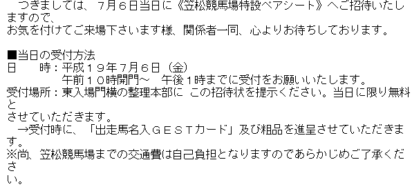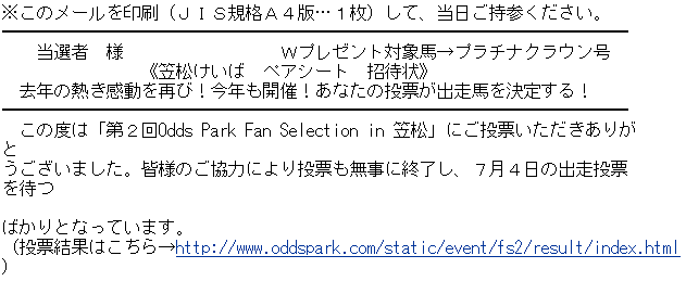 昨日、我が家から見て北のほうから、こんなメールが届きました。 一部を紹介します。512キロバイト以上の大きさのファイルのアップロードが できないので、2つに分けて。 メールその1 メールその2 「第2回Odds Park Fan Selection in 笠松」A賞(ペアシート)当選通知が 届いたのです。 もしかしたら当たっちゃったりなんかして、などと思いつつ、ネットで 出走希望馬の投票をしたのですが、まさか当たるとは。 ちょっと驚いております。 昨年は、馬系ブロガーさんや、ホームページの管理人さんなどが 多数当選されたという話を聞きましたが、今年はどうなんでしょう。 ド平日なのですが、休みをねじ込んで笠松に突撃する予定です。 で、問題は、ワシの横に座って、馬券買ったり、唐揚げ串に舌鼓を打ったり 「そのままーーー!!」などと絶叫してくれるパートナーをどうするか。 また昨年の話になってしまいますが、当選されてもペアシートに一緒に座る人が 見つからず、やむなく一人で来場した人も多かったらしいですね。 オフライン上でワシと面識がある方がどれだけ、このブログを見ているかは わかりませんが、一応書きますか。 問題ないぞという物好きな方、至急連絡をw。 ※7月4日1時20分頃追記 とりあえず、ここで締め切りとします。 運が良ければ、プラチナクラウンと口取り写真が撮れるかも。 それにしても、こんな戦績のオグリキングよりも順位が下というのが、 ちょっと納得いかないところです。 たぶん名前だけで人気を集めたのでは、と思うのですが。 オグリキングのファンには申し訳ないけれども。 |