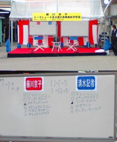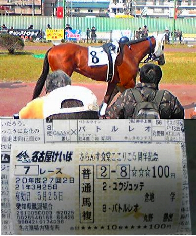 携帯電話のカメラで撮った下手な写真もつけます。 いい加減、壊れたデジカメを修理に出すなり、新しいものを買うなり しないとなあ…。 さて、今日は、仕事を昼で早退し、土古へ行ってきました。 お目当ては、やはり名古屋大賞典。年度末を締めくくる一戦であるので、 何だかんだ言っても見ておきたかったもので。 午後2時過ぎに現地へ到着。他場で良く見られる重賞を告知する看板などは 掲示されておらず、良くも悪くも、普段の土古。 悪い言い方をすれば、「やる気あるのか?」という感じ。 ポスターは場内のあちこちに張られていましたが。 以前から気にかけていながらも、ライヴで見る機会に恵まれなかった、 アラブの名馬・マリンレオの半弟、バトルレオ。ようやく見ることができました。 兄の現役時代は映像でしか知らないので、比較してどうとか、ということが 言えないのが残念でなりませんが、決して大きくはないけれども馬体重の 数字以上に大きく見せる体つきや動き、兄に似たきれいな栗毛の馬体が印象に 残りました。 レースは、1番人気のユウジュッテを3番手の外目でマークし、直線で抜け出す 完勝。このところは、順調に使われてきている様子。一日でも長く 現役で頑張ってもらいたいものです。 そして、メインの名古屋大賞典。サカラートを除いた中央勢3頭の三つ巴だとか、 スマートファルコンが断然、などという下馬評のあったこのレース。 パドックを少しだけ見て、これは3頭でどうしようもないなと、相馬眼の無い ワシにもわかりました。パドック近くで行なわれていた某イベント(後述)を 見るつもりはなかったので、そそくさと東スタンドへ避難。 馬券のほうは、ガチガチな結果になるのは承知の上で、あえて、 スマートファルコン、ワンダースピード、メイショウトウコンの馬単3頭ボックスで 内角のやや高め狙い。スマートとワンダーの表裏は厚くしましたが。 あとは、夢馬券として、1・2着にスマート&ワンダー、3着にタータンフィールズを 置いた3連単を100円×2通り分。先日の黒船賞でのフサイチバルドルの 大健闘が頭にあったもので。 スタート直後はややごちゃごちゃしたように見えましたが、大外枠と、3コーナー まで距離がある1900m戦ということもあり、スマートファルコンが先行力を 存分に生かしてハナへ。中盤まで引っ張りきりだったものの、勝負どころで 手綱を緩めて逃げ込みを図る展開に。最後はワンダースピードも良く差を 詰めたものの、スマートファルコンが逃げ切り勝ち。最後は、見た目以上に 余裕が感じられました。悔しいけど強いですね、この馬。 秋のJBCへの出走も視野に入れているようですが、無事に出られるようならば、 普通に勝ち負けでしょうね。 馬券のほうは、微妙に資金配分を誤り、発泡酒2本くらいの損でした。下手くそ。 さて、見るつもりも、写真を撮るつもりもなかった某イベント。 藤川京子さんのトークショー&メインの予想でした。 画像検索でたどり着いた方には、一言謝っておきます。 正直、着エロにはまったく興味がないのです。ごめんね。 「あれだけできるのなら、脱げばいいのに。」と、いつも思っています。 ただ、一言だけ言うのなら、写真で見るよりも、きれいな人でした。 ちなみに、ステージと、予想結果はこんな感じ。 中京スポーツの清水記者ともども、大振りしすぎですね。 イベントなので、それなりに盛り上げなければならないのもわかりますが、 『競馬エース』紙上でのこの記事のような潔さもほしいものです。 さて、自分の想像以上にガッチガチの結末となった今年の名古屋大賞典。 ムーンバレイが吉田稔の神騎乗で2着に粘りこみ、中央勢ではもっとも人気薄 だったアルドラゴンが1着となり大波乱となった2007年を除いては、 堅く納まるのが近年のパターンではあります。とはいえ、そろそろ、 このレースのあり方も考える必要はあるのではないかとも思うのです。 無くせ、とは言いません。普段は中央しか見ない自称競馬ファンが多数来場し それなりのお金を落としてくれるわけだし(最終レースを見ずに帰るけどw)、 インターネットや電話投票も含めて、全国での場外発売もある。 そんなレースだからこそ、少しでも『売り上げが上がる=馬券を買いたいと 思わせるレース』にする努力は必要だと思います。 収得賞金や、グレードレースでの勝ち数に応じた別定戦に改め、強い馬には それ相応の斤量を背負わせるとか、思い切ってハンデ戦にして、斤量に幅を 持たせてしまうとか。 やり方はいくらでもあると思うのです。少なくとも今のままでは、 中央からちょっと強い馬がやってくると、馬券的にも旨みがなく、競馬ファンの 立場からしても面白みに欠けるレースになってしまいます。 以前も同じようなことを書いた記憶がありますが、適当にレースを組んで、 適当に馬券を売れば、大したことをしなくても主催者が儲かるという図式は、 もう成り立ちません。 どうすれば売り上